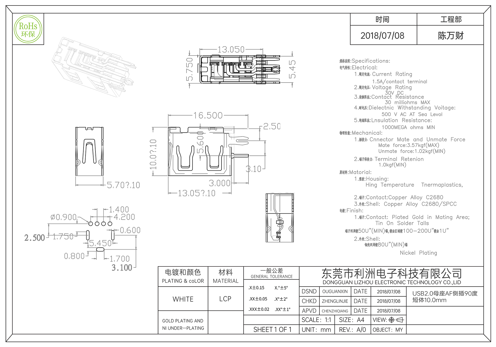 USB2.0母座AF侧插90度短体10.0mm