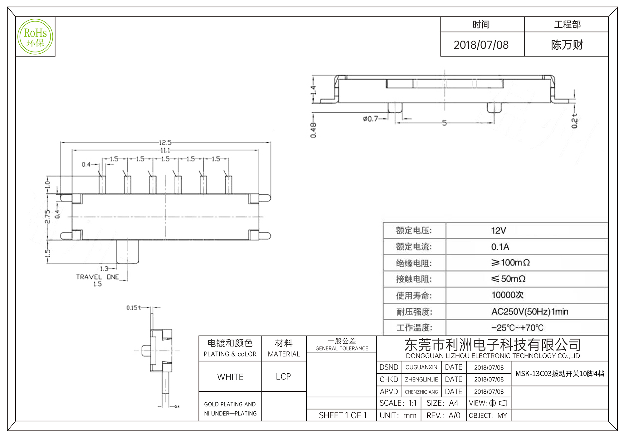 MSK-13C03拨动开关10脚4档