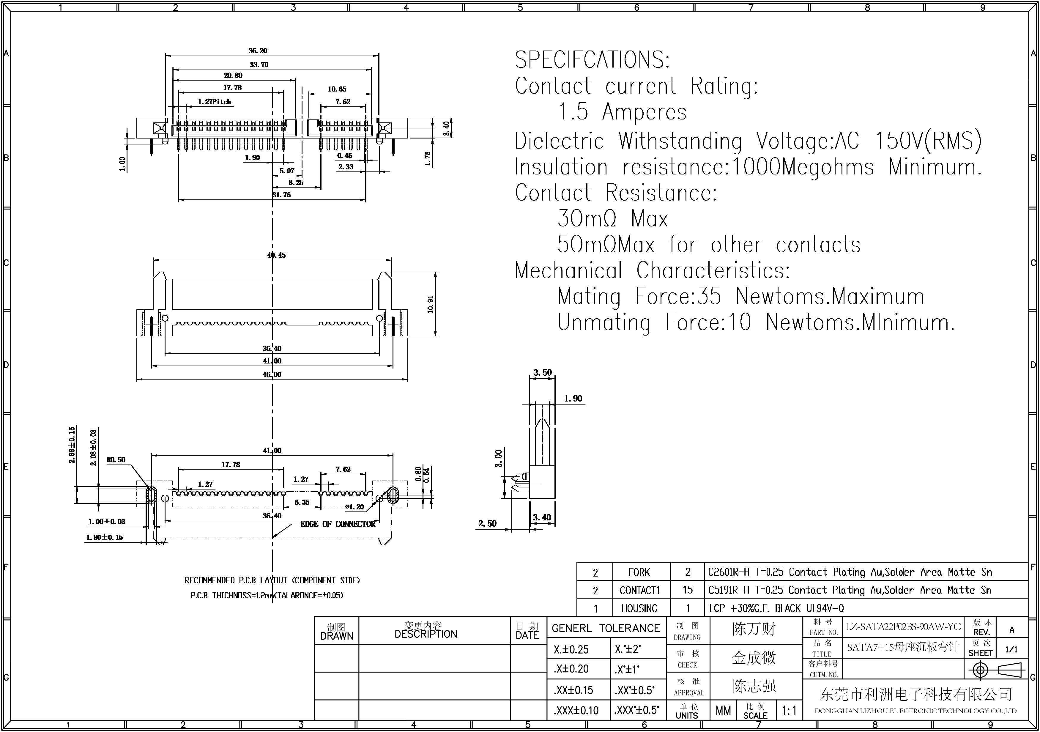 SATA7+15母座沉板弯针