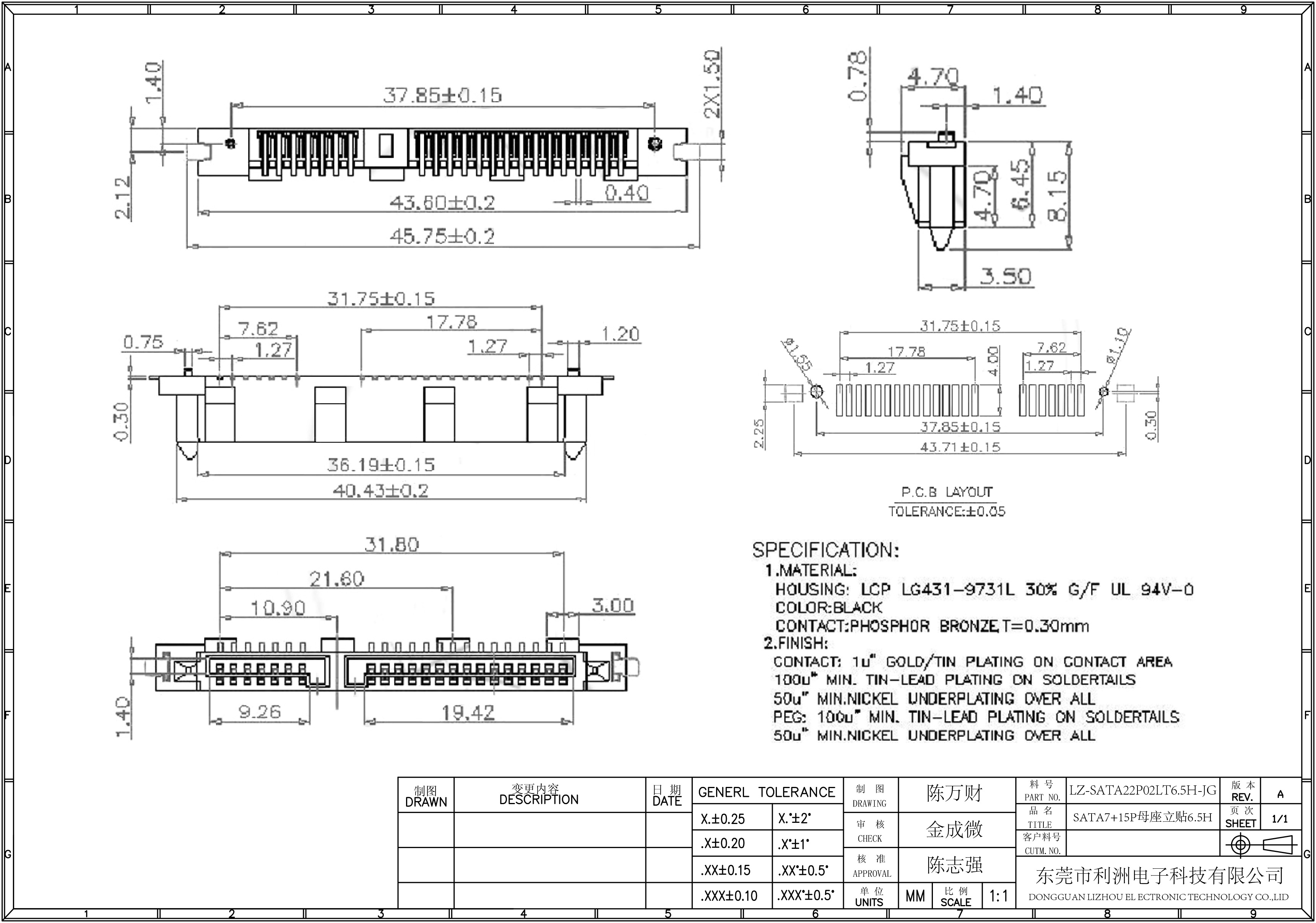 Contact: 1u"Gold/Tin Plating On Contact Apea, 100u" min tin-lead plating on scldertails, 50u"min nickel underplating ower all