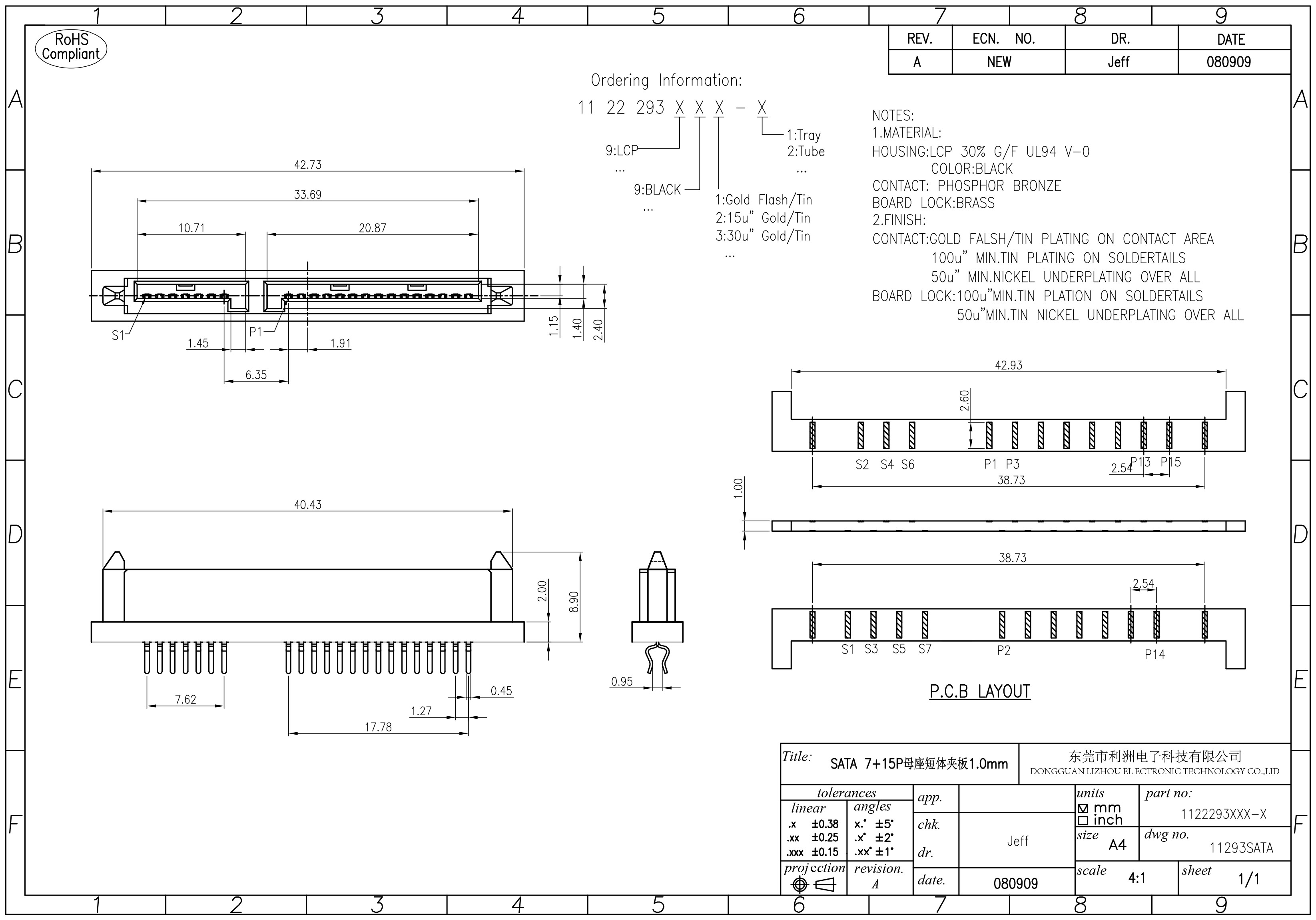 Finish Contact: 15u“gold/tin plating on contact area,100u” min tin-lead plating on soldertails,50u“ min nickel underplating overall