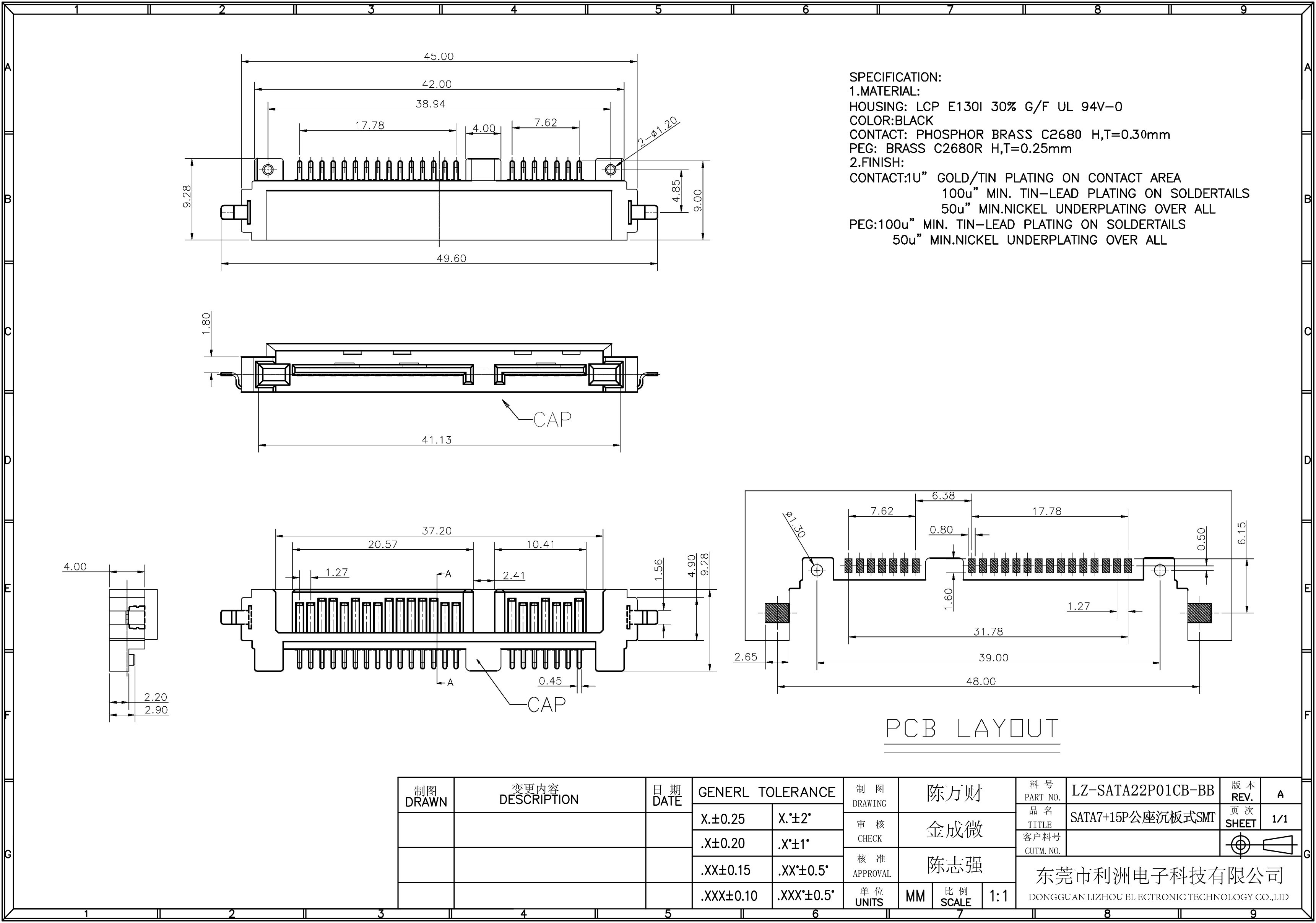 Finish Contact: 1u"gold/tin plating on contact area 100"u min tin-lead plating on soldertails 50u"min nickel underplating over all
