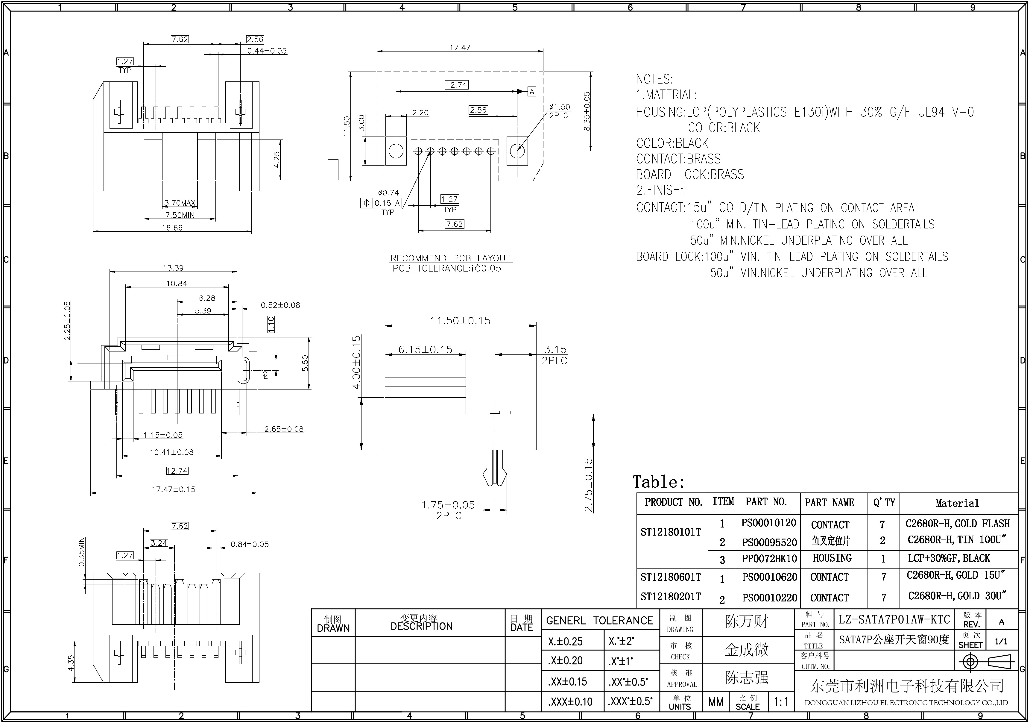 Finish Contact: 15u"gold/tin plating on contact area 100u"min tin-lead plating on soldertails 50u"min nickel underplating over all