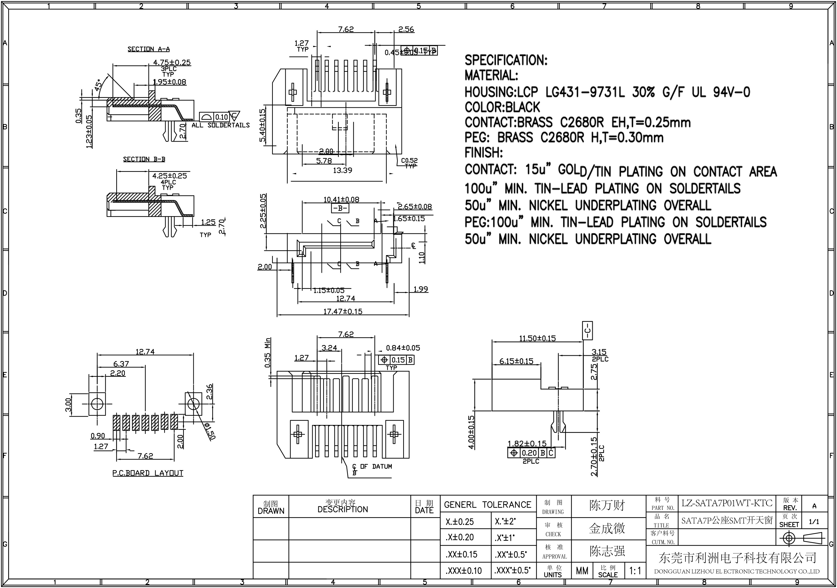 Finish Contact: 15u" gold/tin plating on contact area 100u" min tin-lead plating on soldertails 50u" min nickel underplating overall