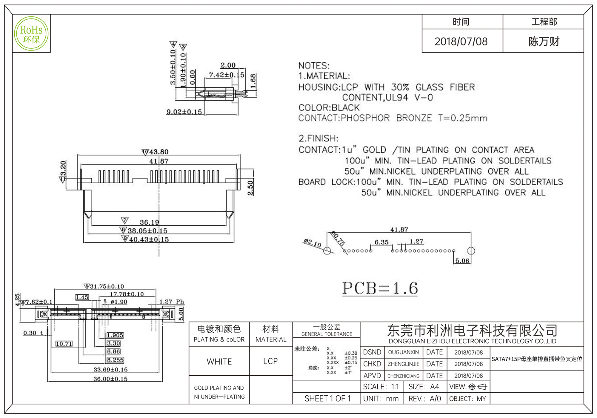 Finish Contacts: 1u" gold/tin plating on contact area 100u" min tin-lead plating on soldertail 50u" min nickel underplating over all