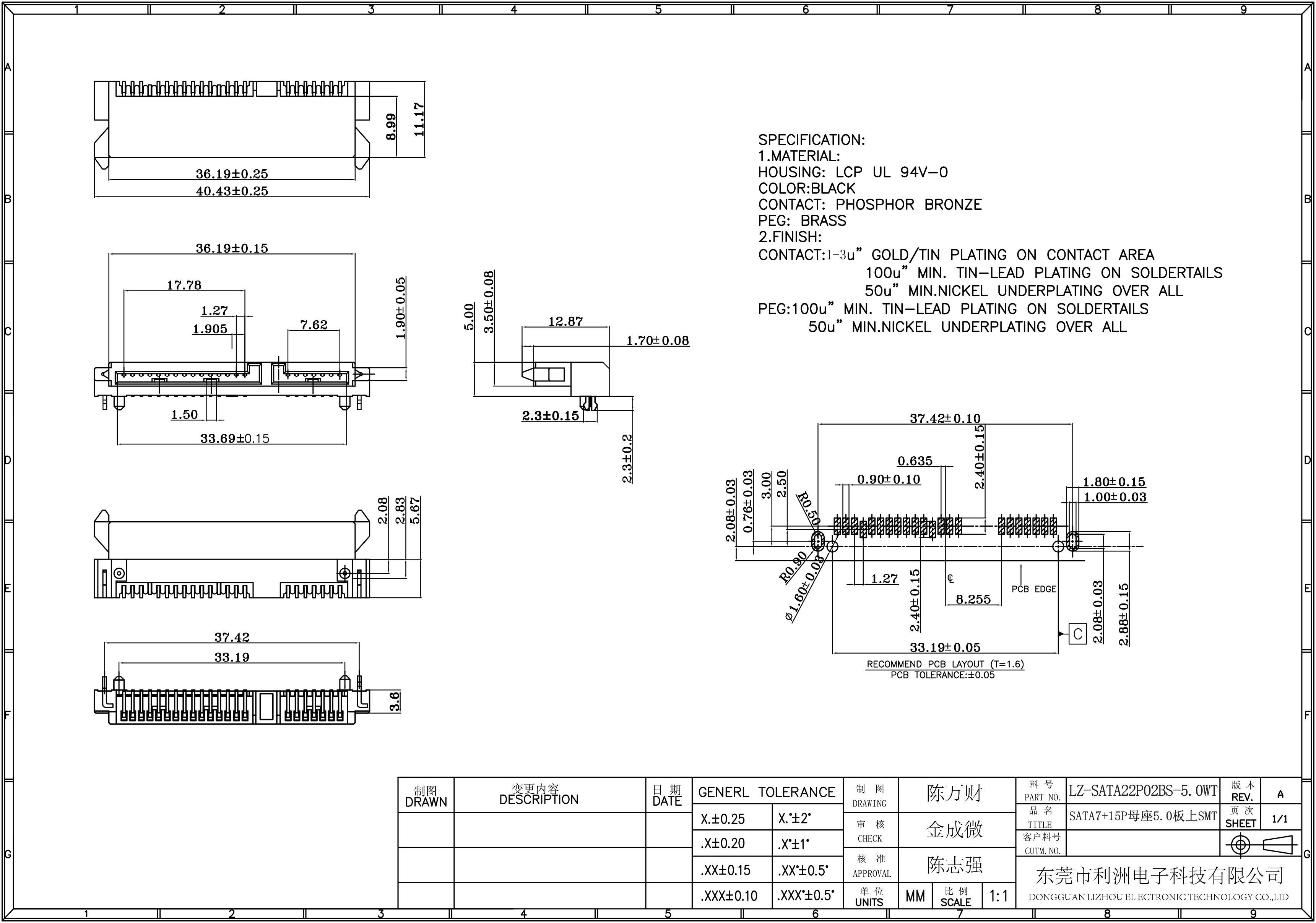 Finish Contact: 1-3u" gold/tin plating on contact 100u" min tin-lead plating on soldertails 50u" min nickel underplating over all