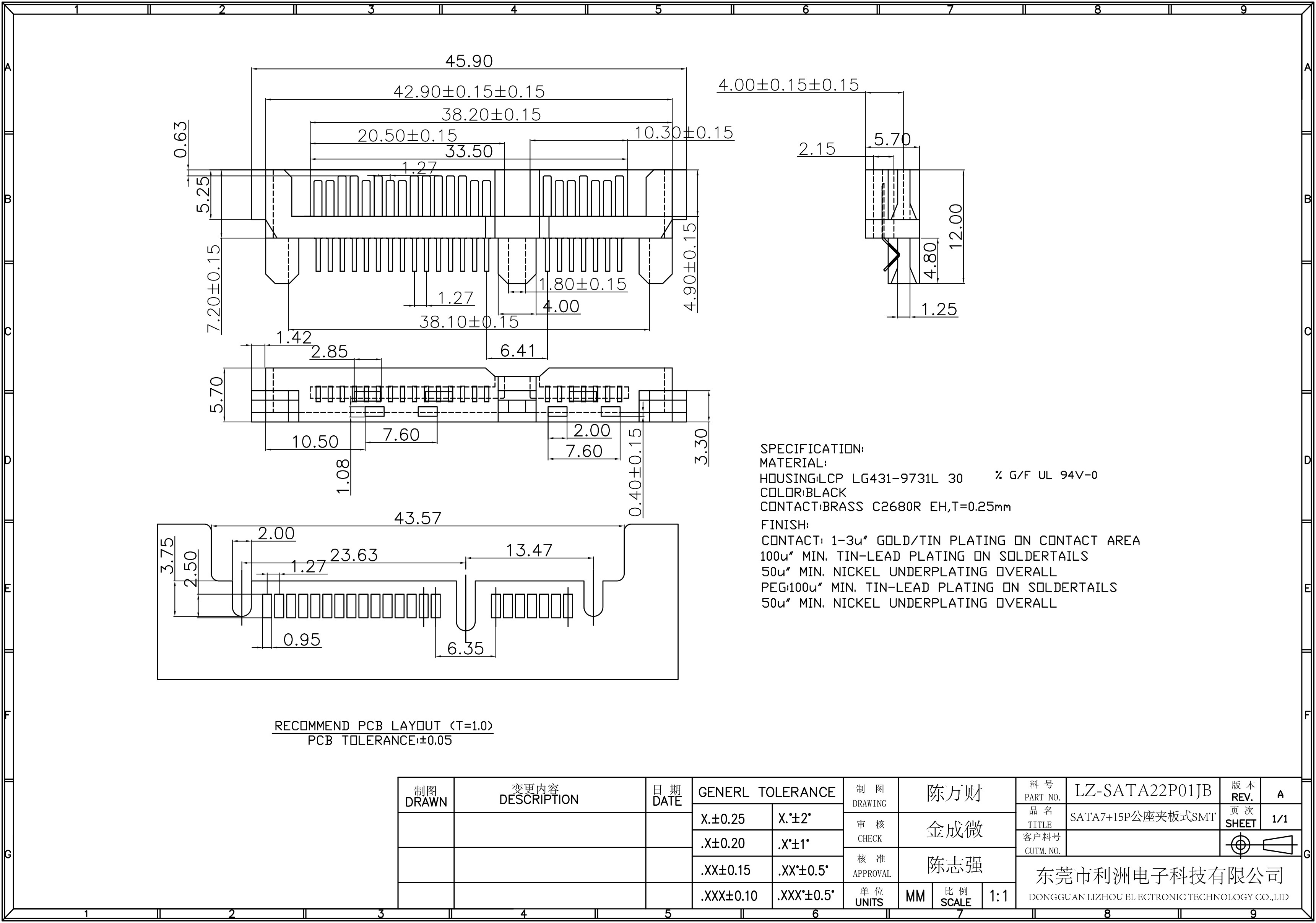 Finish Contacts: 1-3u" gold/tin plating on contact area 100u" min tin-lead plating on soldertails 50u" min nickel underplating overall