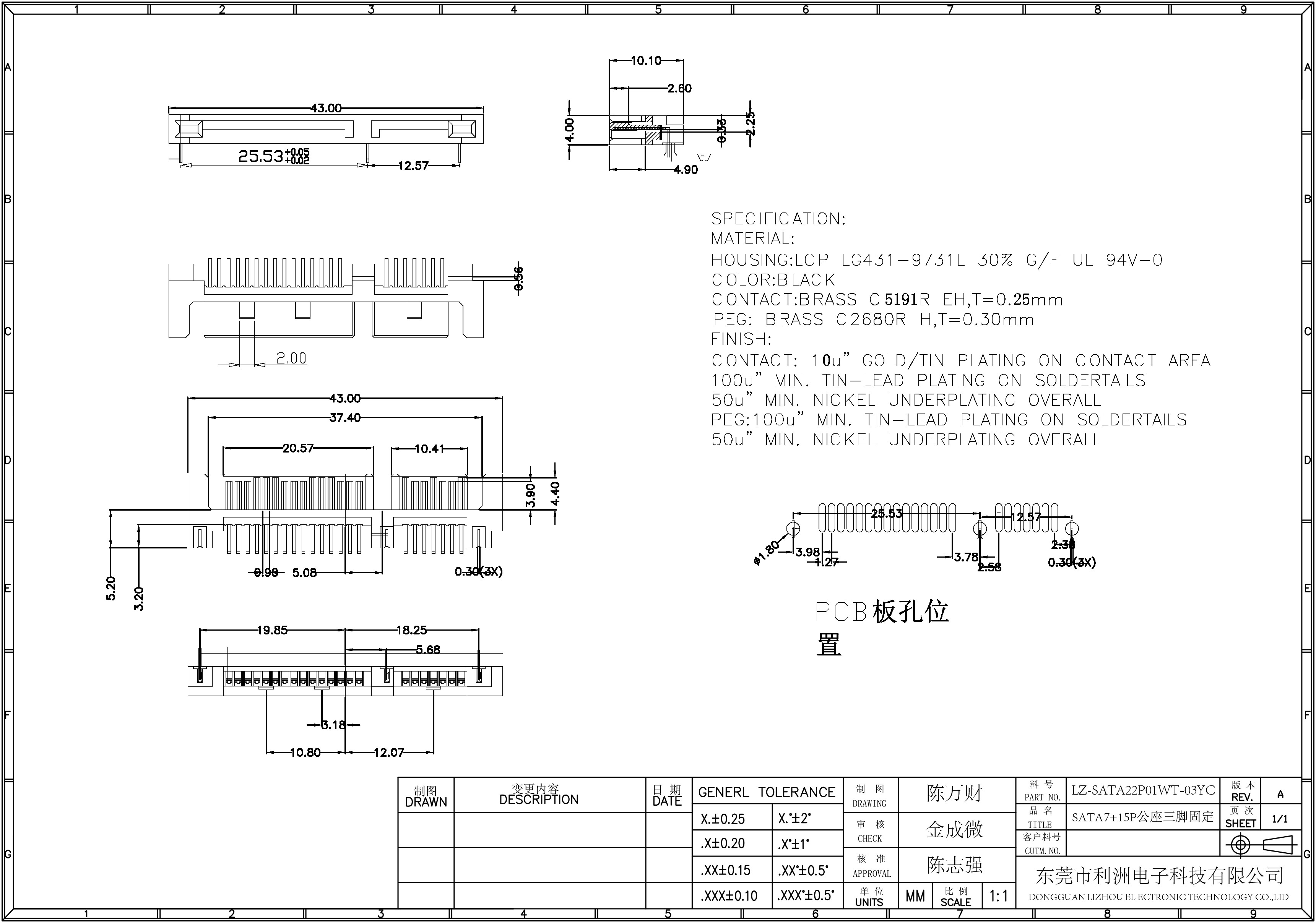 Finish Contacts: 10u" gold/tin plating on contact area 100u" min tin-lead plating on soldertails 50u" min nickel underplating overall