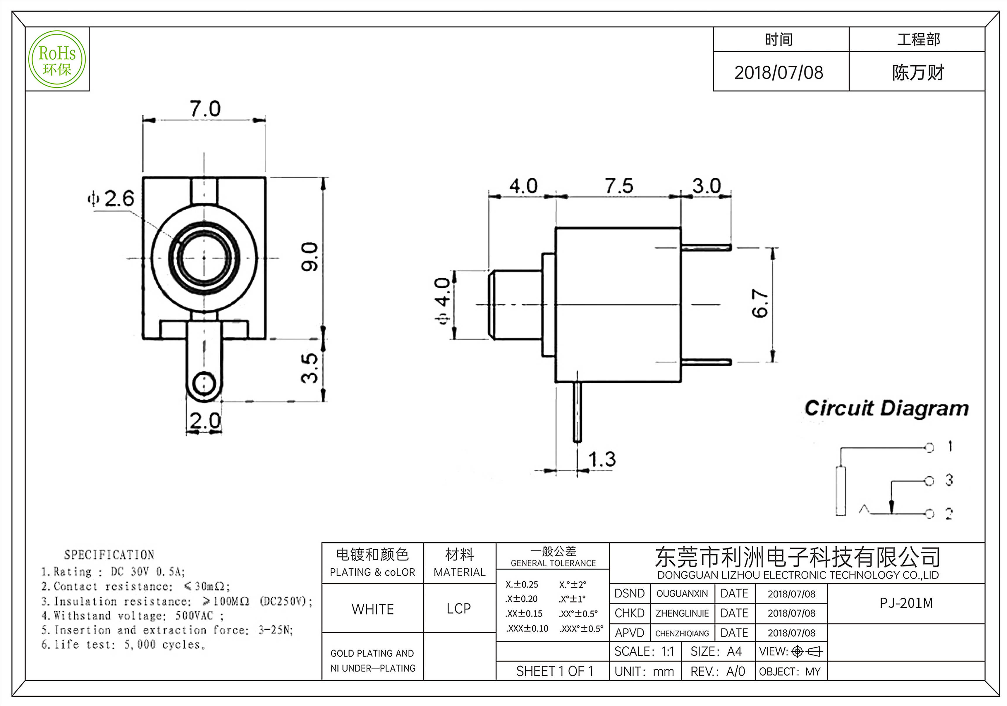 PJ-201M耳机插座2.5mm带螺纹三脚插件