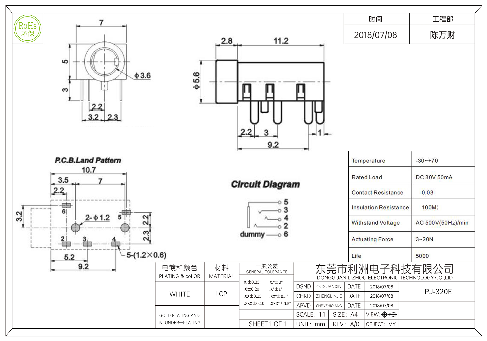 Withstand voltage: AC 500V(50Hz)/min