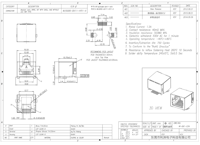 RJ45卧贴带屏蔽卧式