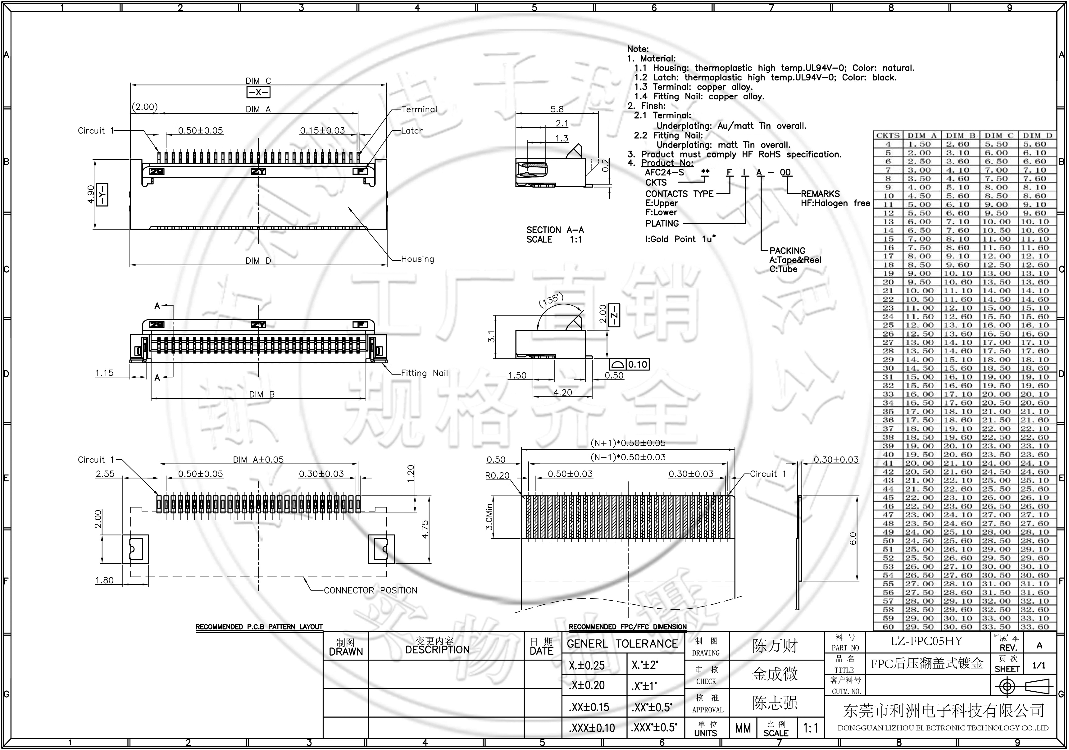 • FPC0.5mm间距后压翻盖式针脚镀金