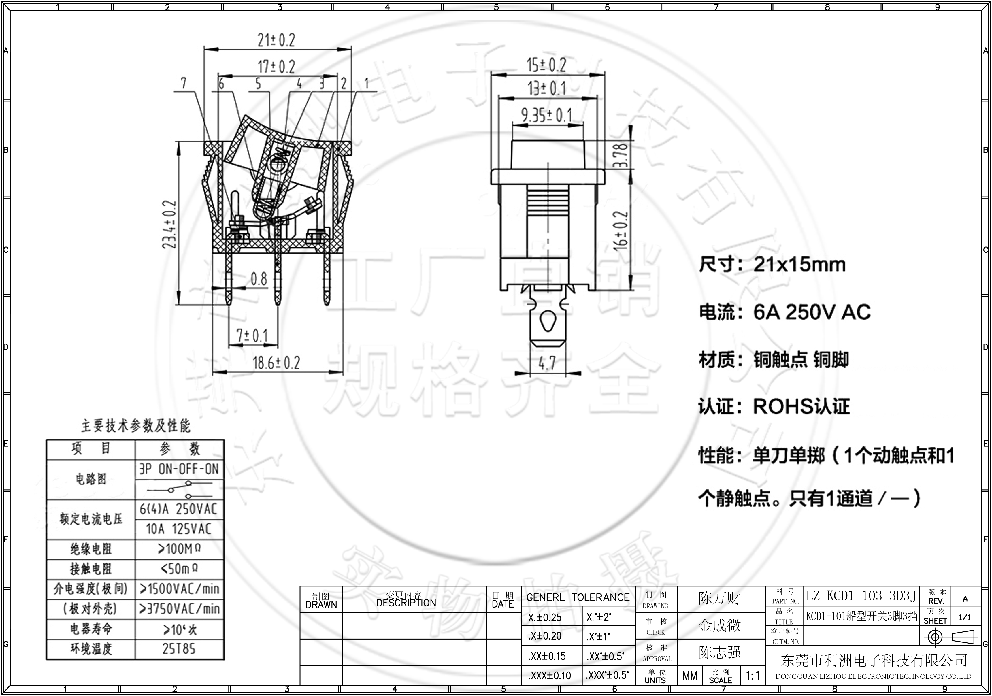 额定电流、电压: 3A 250V 6A 125V