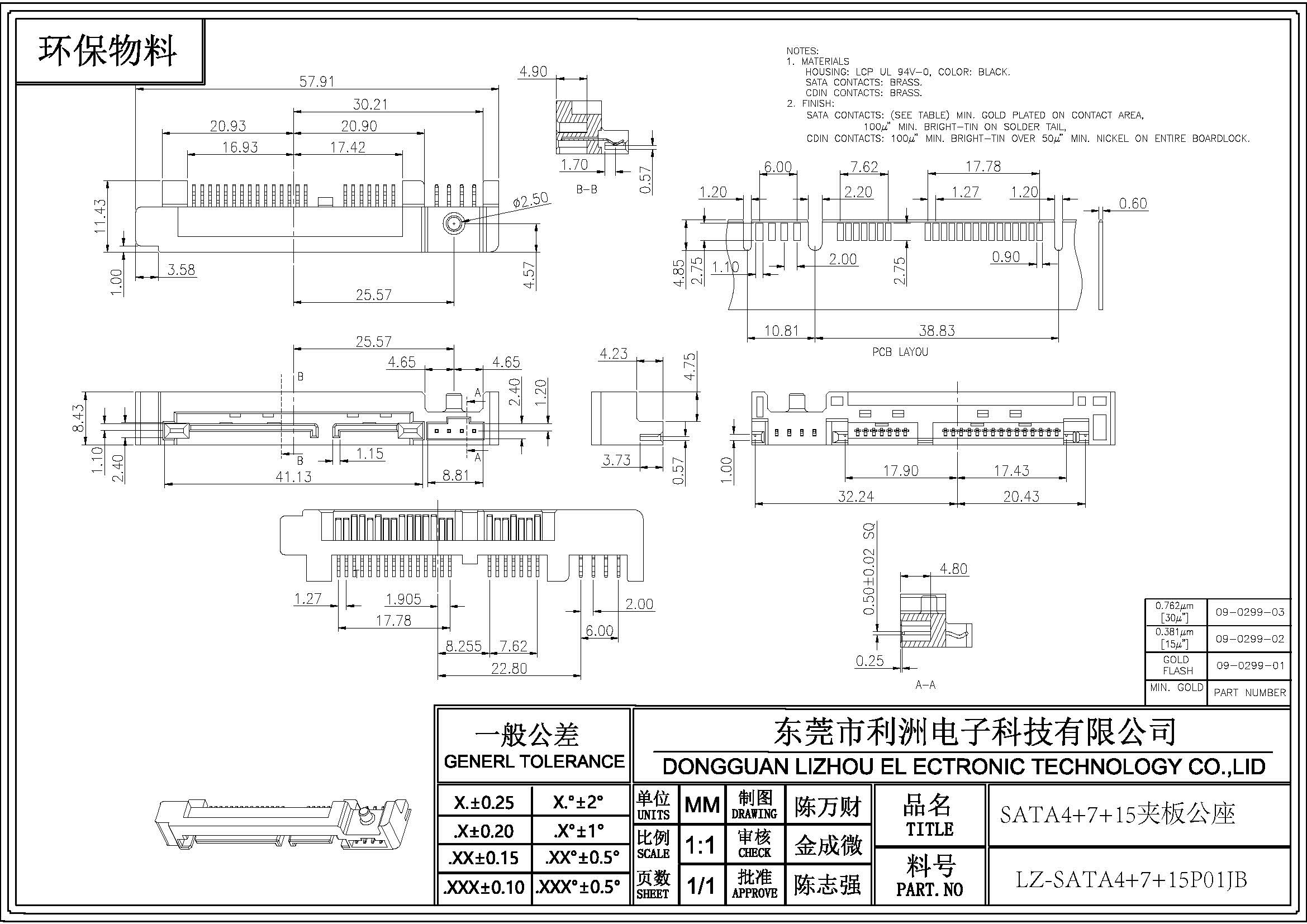 Sata Contacts: (see table) min, gold plated on contact area, 100µ" min, bright-tin on solder tail.