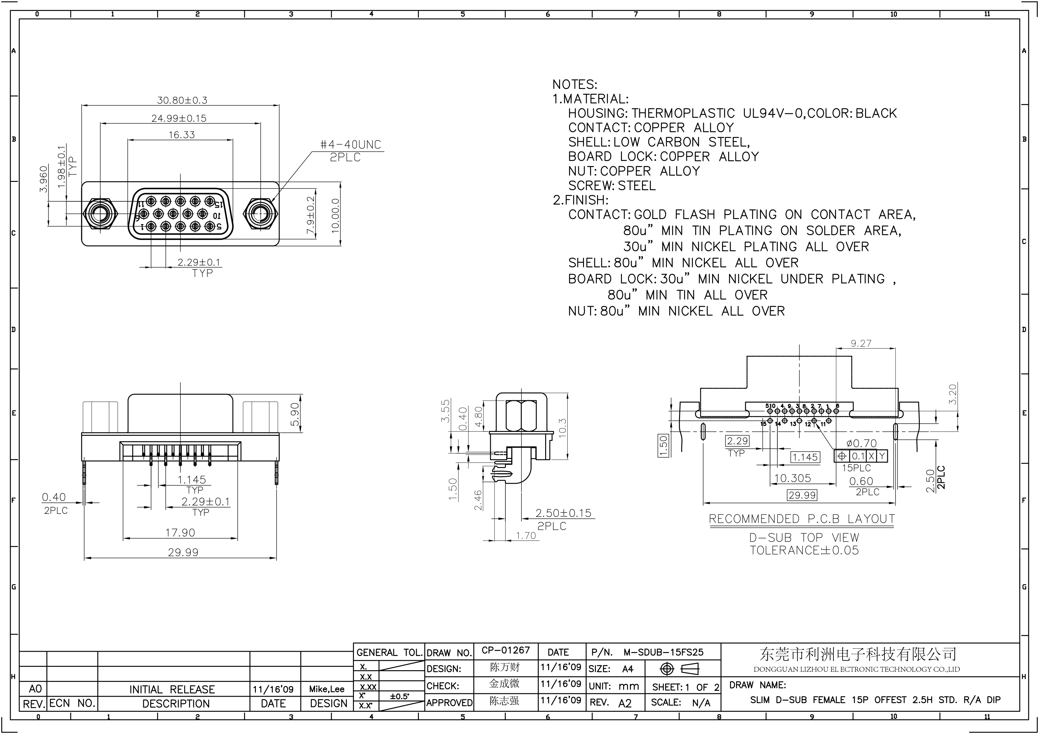 Contact: Gold flash plating on contact area, 80u” min tin plating on solder area, 30u" min nickel plating all over