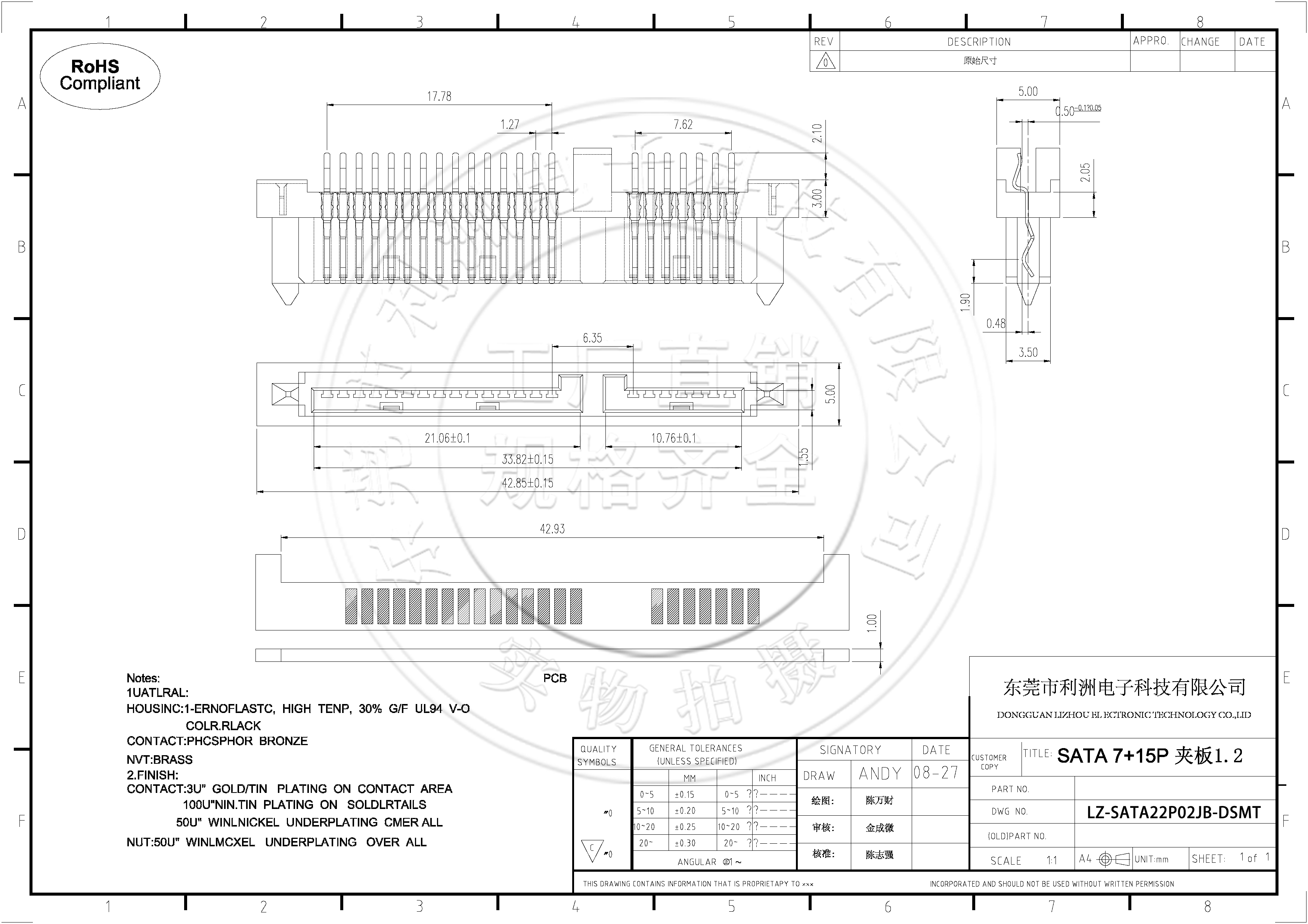 Contact: 3u" Gold/tin plating on contact area 100u" min.tin plating on soldlrtails 50u"winlmcxel underplating over all